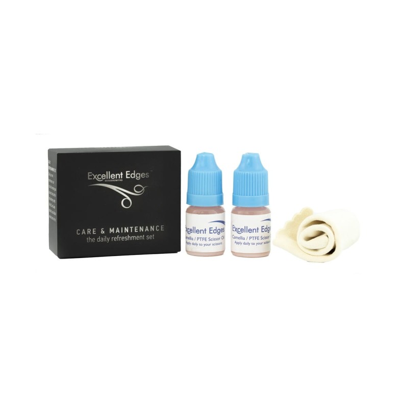 Dbaj o swoje nożyczki każdego dnia. Z zestawem produktów do pielęgnacji Excellent Edges będzie to łatwe i przyjemne. Olejek kameliowy oraz specjalna ściereczka to wszystko, czego potrzebujesz aby utrzymać nożyczki fryzjerskie w idealnym stanie na długie lata. Podwójny zapas olejku w zestawie wystarcza na dłużej, w niższej cenie.