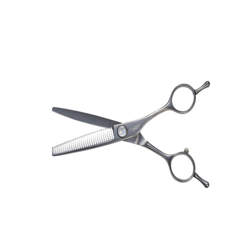 Nożyczki teksturujące z przeciwległym uchwytem, ostrzem z zębami o promieniowej konstrukcji 27, 30 lub 32 i o długości 5.7". Podpórki pod palce na każdym uchwycie pozwalają fryzjerowi na wybór, które ostrze będzie ruchome, a które nieruchome: gładkie, czy ząbkowane.